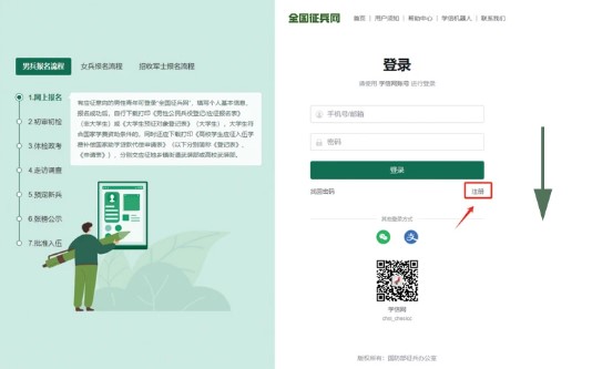 1、登录全国征兵网,点击“应征报名(男兵)”进入页面;男兵在应征报名之前,要先完成兵役登记。