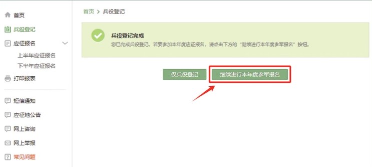 5、完成兵役登记后,点击“继续进行本年度参军报名”按钮,完善个人信息,填报信息遇到困难及时咨询征兵办工作人员。