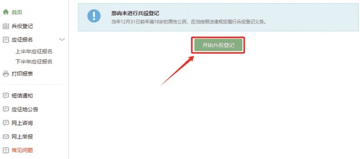 4、登录系统后,如果出现以下界面,适龄男青年请点击“开始兵役登记”按钮进行登记,如果已完成登记,此步骤可以忽略!