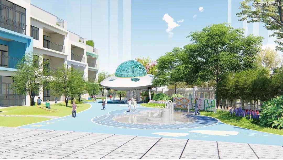 幼儿园建筑共三层,总面积超过3600平米,外观整体色调以米黄色为主。筹建初期,考虑到“儿童是空间最灵活跳跃的元素”,幼儿园在设计上充分结合儿童活泼好动的特性,采用“空间+家具+日常装饰+孩子”的理念,利用色彩、自然、科技等元素打造一个以探秘宇宙·亲近自然为主题的幼儿园景观环境。幼儿园顺应儿童天性,发展儿童个性,3-6岁儿童在这里不仅可以学到知识,还可以通过各类游戏互动,接触集体生活,培养良好的生活习惯。