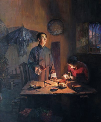 △油画《在党的第一次代表大会上》,画面正中为毛泽东,他的左边依次是董必武、邓恩铭、陈潭秋,右边依次是何叔衡、王尽美。
