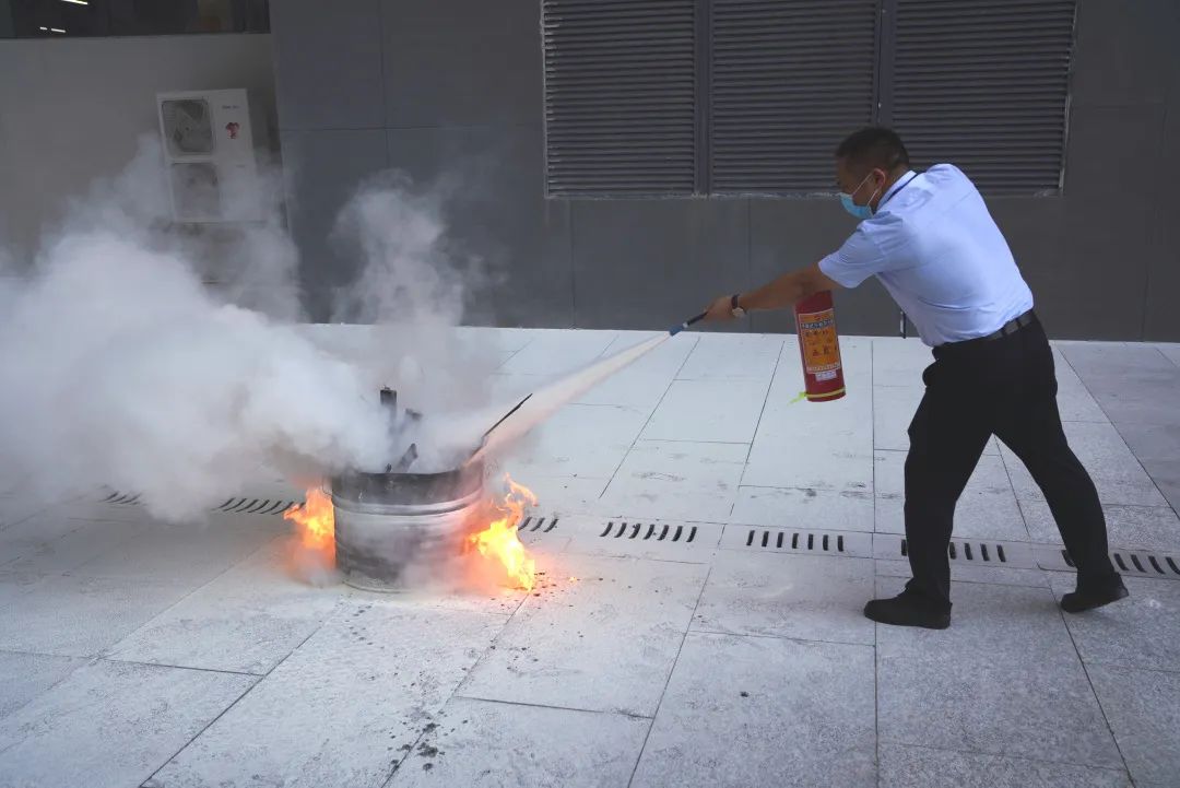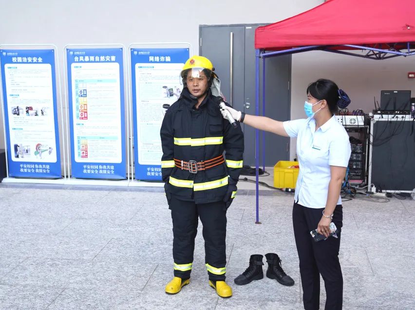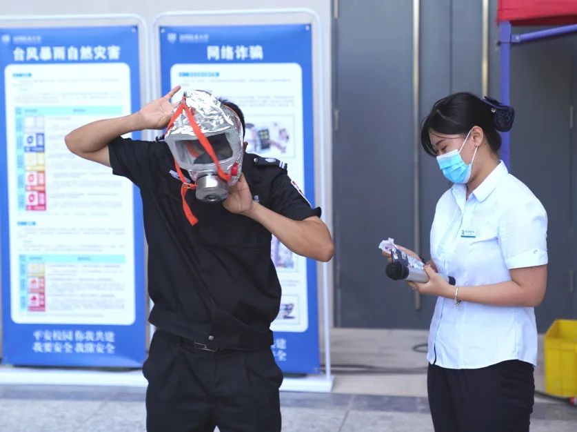 在安全知识讲解与体验互动环节,安全保卫中心工作人员为大家讲解了消防防护头罩、灭火毯等逃生器材以及灭火器的使用规范,参与活动的师生在现场进行学习实践,掌握灭火器使用方法。