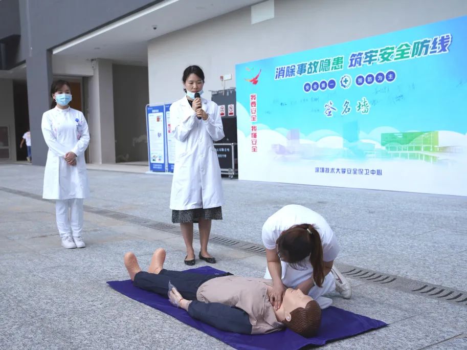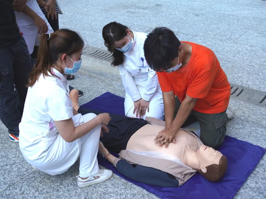 校医院工作人员为大家细致讲解并演示了心肺复苏急救知识,为现场学习的师生进行具体指导和解惑,帮助师生了解、掌握心肺复苏急救过程中的要点。