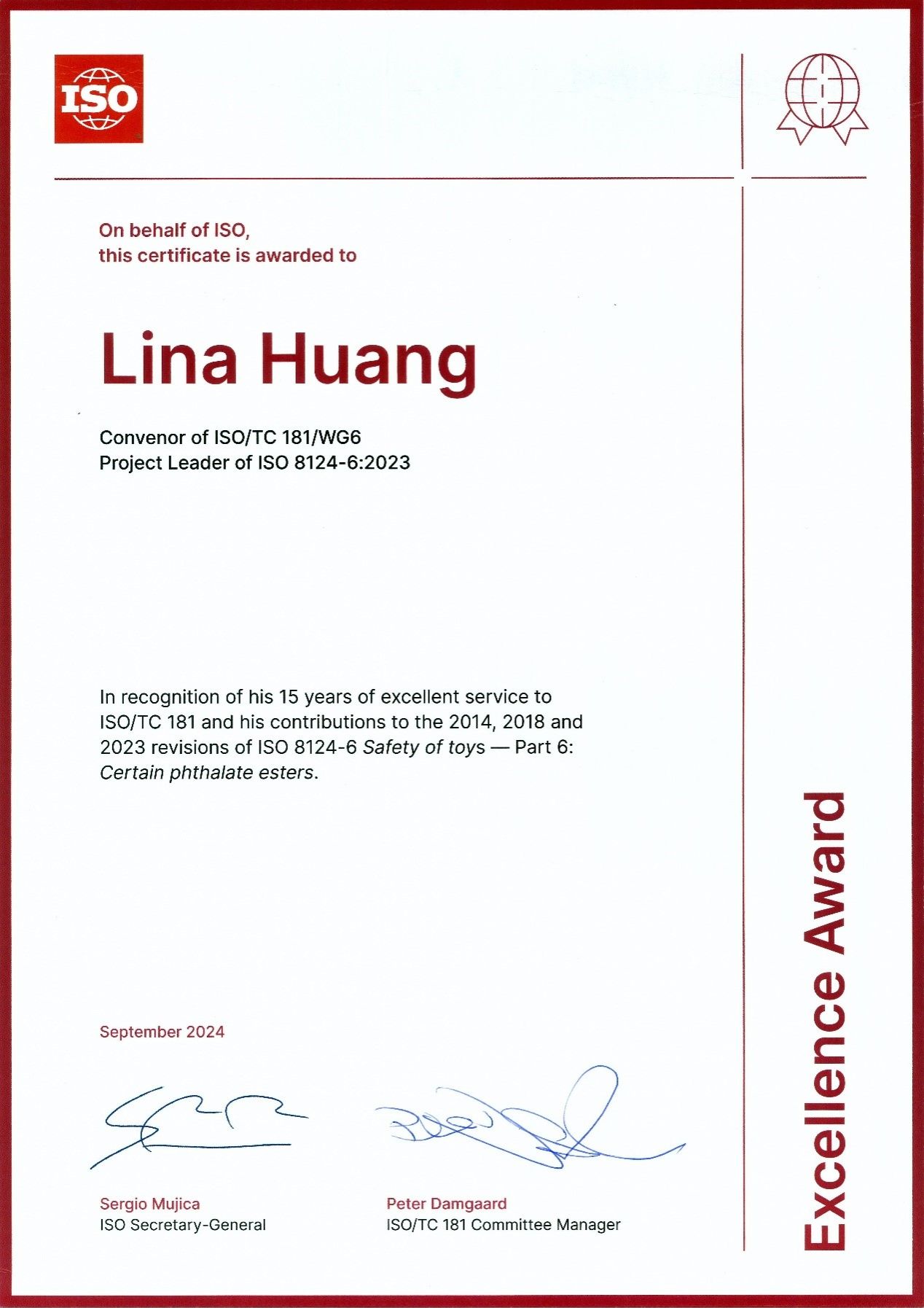 在9月20日的全体会议上,ISO/TC 181执行主席Christian Wetterberg先生代表ISO国际标准化组织向黄理纳教授颁发了TC 181本年度唯一的“ISO卓越贡献奖”,以表彰其在国际玩具标准领域十五年来的卓越贡献,特别是对ISO 8124-6《玩具安全 第6部分:特定邻苯二甲酸酯增塑剂》标准三个版本(2014, 2018, 2023)的制修订工作。