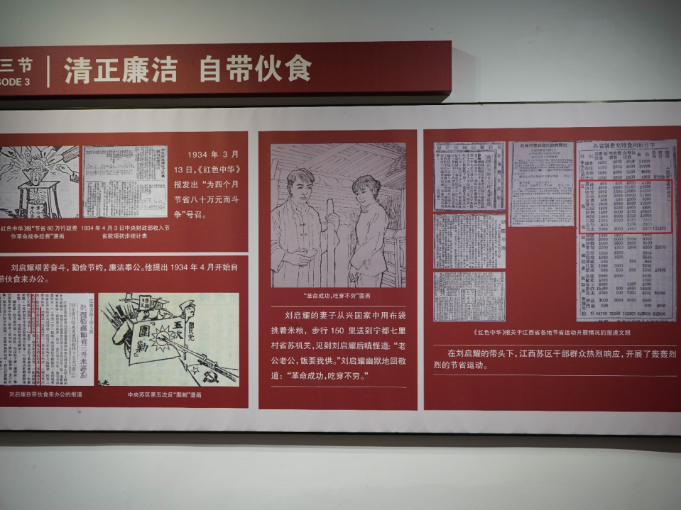 刘启耀纪念馆记载了“腰缠万贯讨米人”刘启耀同志对党忠诚、为政清廉的模范故事。作为中央苏区的干部,他曾自带干粮办公;在第五次反“围剿”失利后,时任江西省苏维埃政府主席刘启耀背着金条乞讨数年,历尽千辛万苦寻找党组织继续干革命,不动用分毫党的经费。刘启耀的事迹是苏区干部优良作风的真实写照,更是一笔划破时空、历久弥新的宝贵精神财富。