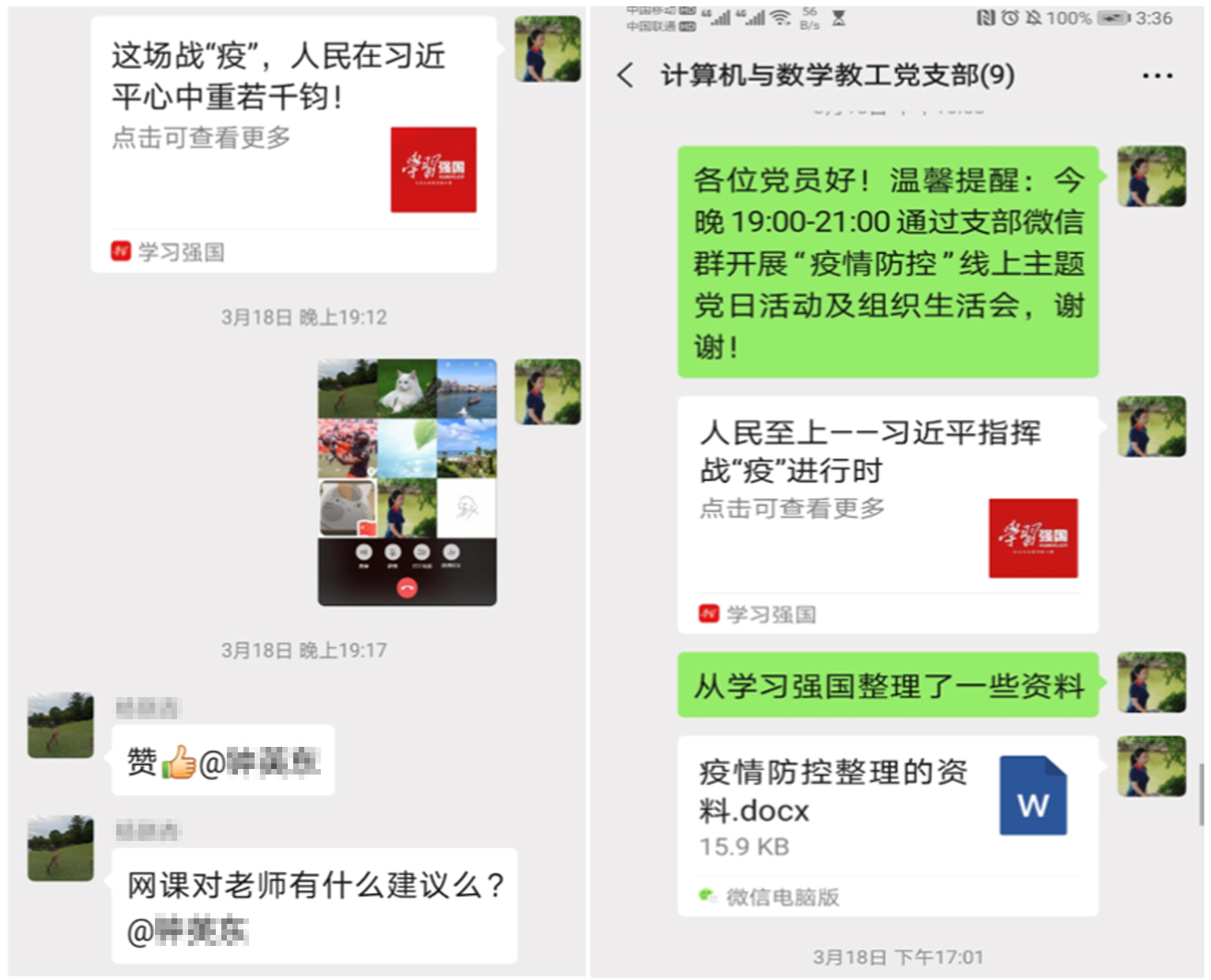计算机与数学教工党支部结合新冠肺炎疫情期间的工作、学习情况、感悟进行线上讨论。支部书记史诗洁同志在支部线上讨论发言中说:“我们支部师生战‘疫’的最直接方式就是做好本职工作。疫情期间,我们通过腾讯课堂等平台开展了教与学,虽然线上教学存在学生反馈难获得、教学进度难把握、作业难收集等困难,但我们也将阻力转化为动力,克服了许多困难,网络教学从手忙脚乱到逐步熟练,同学们的自我进步的意识也提高了,有很大收获。”
