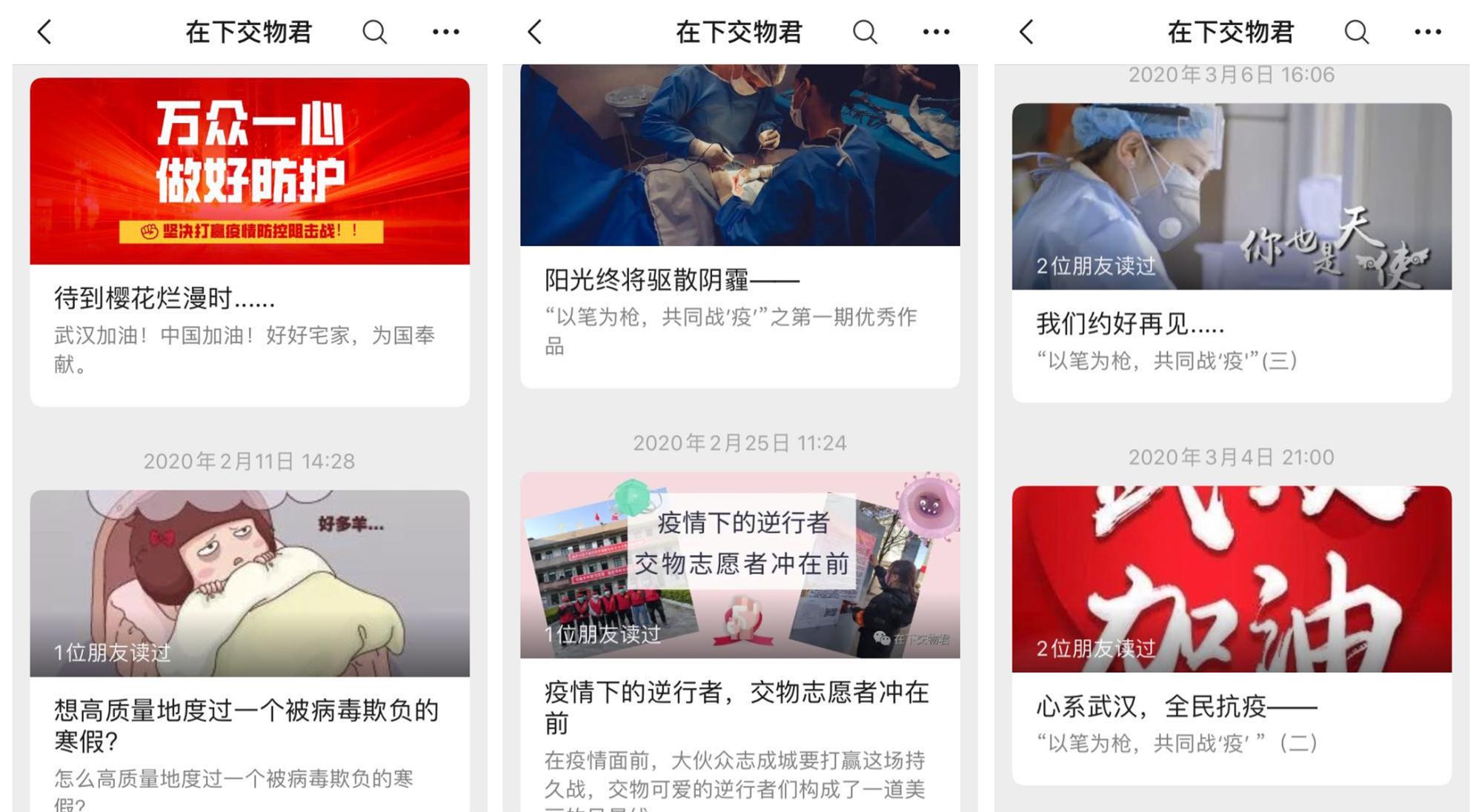 城市交通与物流学院党总支以公众号“在下交物君”为载体,做好宣传引导工作,疫情期间共发布《想高质量地度过一个被病毒欺负的寒假?》《疫情下的逆行者,交物志愿者冲在前》《心系武汉,全民抗疫》等8篇公众号文章,利用网络媒体做好疫情防控期间的宣传引导工作,科普防疫知识、筑牢思想防线、分享身边抗疫事迹,弘扬正能量。