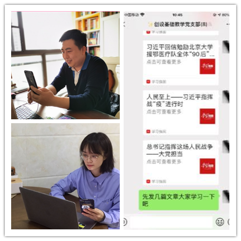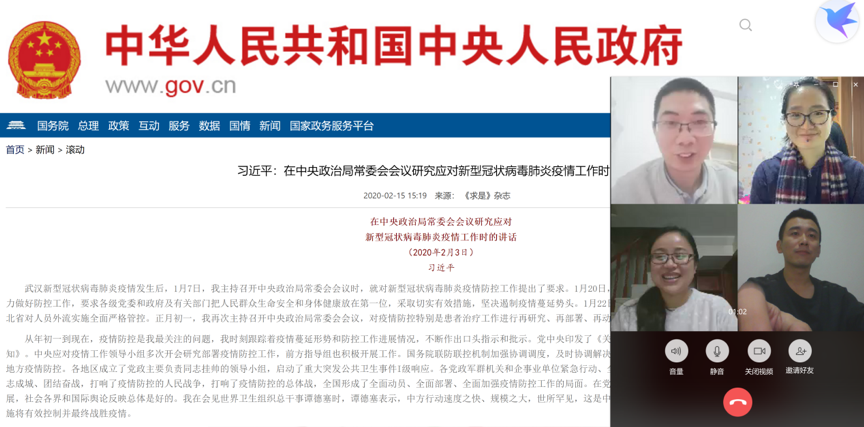 各学院党总支、各直属支部结合各单位实际情况,适时开展“线上”集中学习活动。由支部书记带头,深入学习“习近平总书记在中央政治局常委会会议研究应对新型冠状病毒肺炎疫情工作的讲话精神”以及国家、省市有关应对新冠肺炎疫情防控措施的有关文件等。鼓励教职员工在保障教学和科研等工作稳步开展的前提下积极参与防疫志愿活动,以实际行动践行党员的先锋模范带头作用。