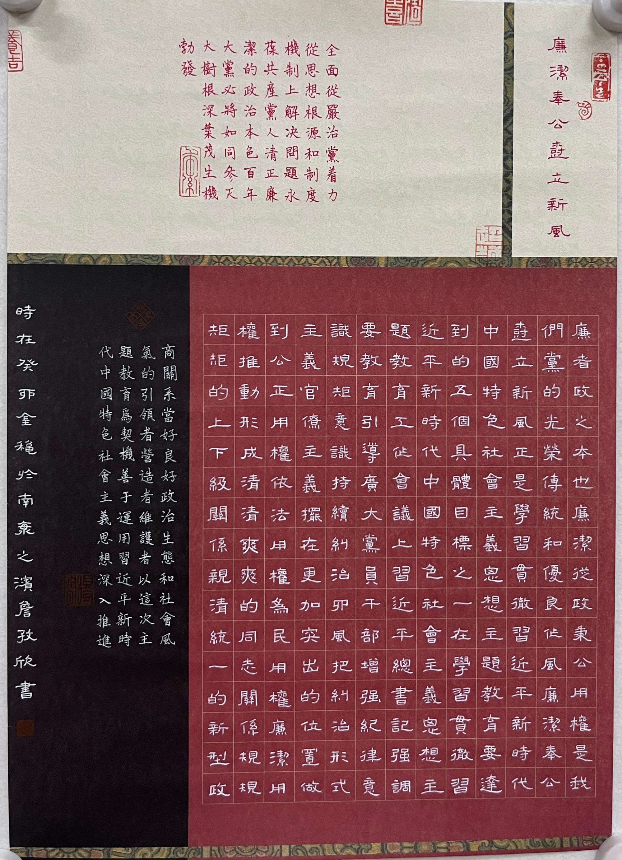 近日,kaiyun开云官方网站纪检监察室联合创意设计学院党总支、书法艺术研究所共同举办kaiyun开云官方网站2023年“清风墨韵”廉洁文化书画作品征集暨展览活动。本次活动共收到书法、绘画、剪纸等60余幅师生投稿作品,经专家评选,共有16幅优秀书画作品获奖,并在图书馆二楼南北大通道进行现场展览,吸引了众多师生、党员干部参观。