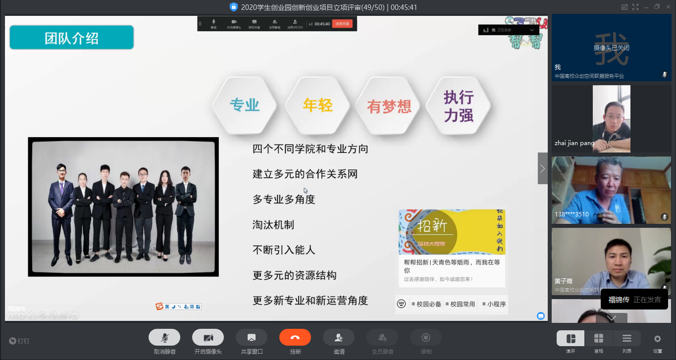 本次立项评审由大数据与互联网学院副院长曹建民教授、战略规划与发展办公室翟剑庞教授、研究生院副院长胡学娟副教授、创业创客与就业指导中心主任黄子嵩等5位导师担任评审专家,采取“7+5”的方式对项目进行综合考评。团队通过线上答辩的方式,阐述了团队的产品或服务、项目计划、发展前景等。评委根据团队情况、项目的可行性、创新性和可操作性、商业模式、市场前景、经济效益及社会效益等方面综合评分,并为参加评审的项目团队提出了很多针对性强,可行性强的意见和建议。