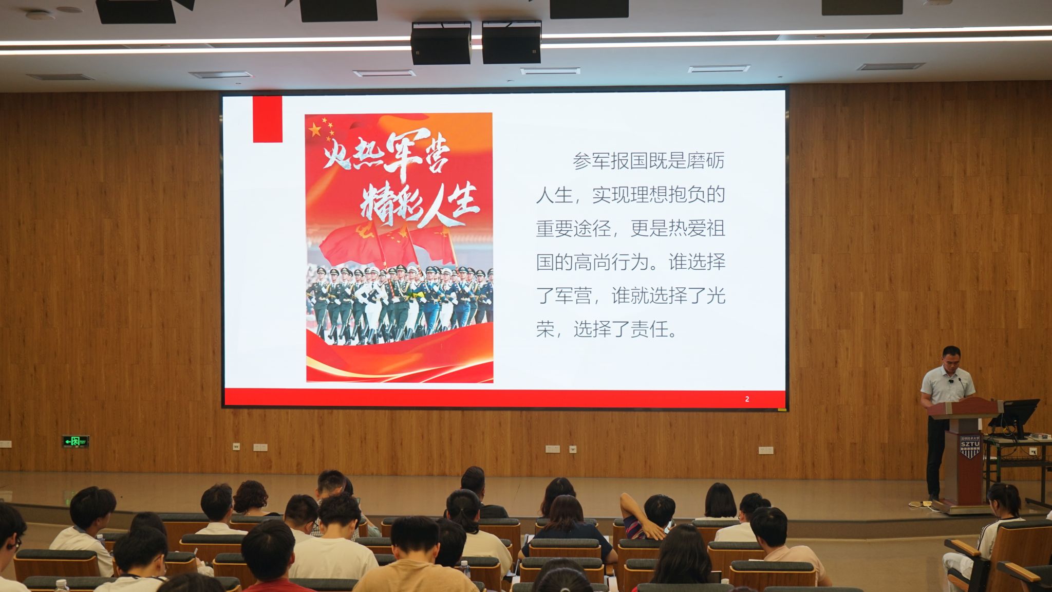 石井街道武装部副部长王菁以“守护家园”的真实案例点燃学子报国热血:“当洪水来袭时,军人是冲锋在前的血肉长城;当和平需要捍卫时,军营是锻造钢铁意志的熔炉。”他详细解读大学生入伍“四个优先”政策与深圳地区的经济补助政策,号召学子“把爱国之心化为报国之行”。