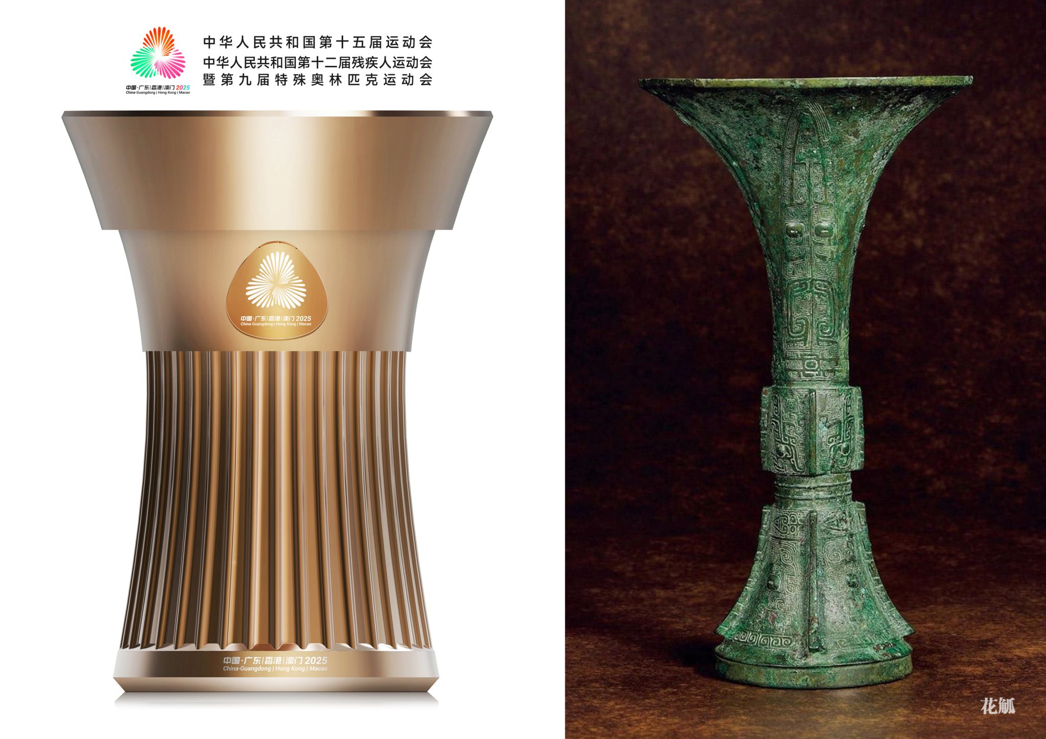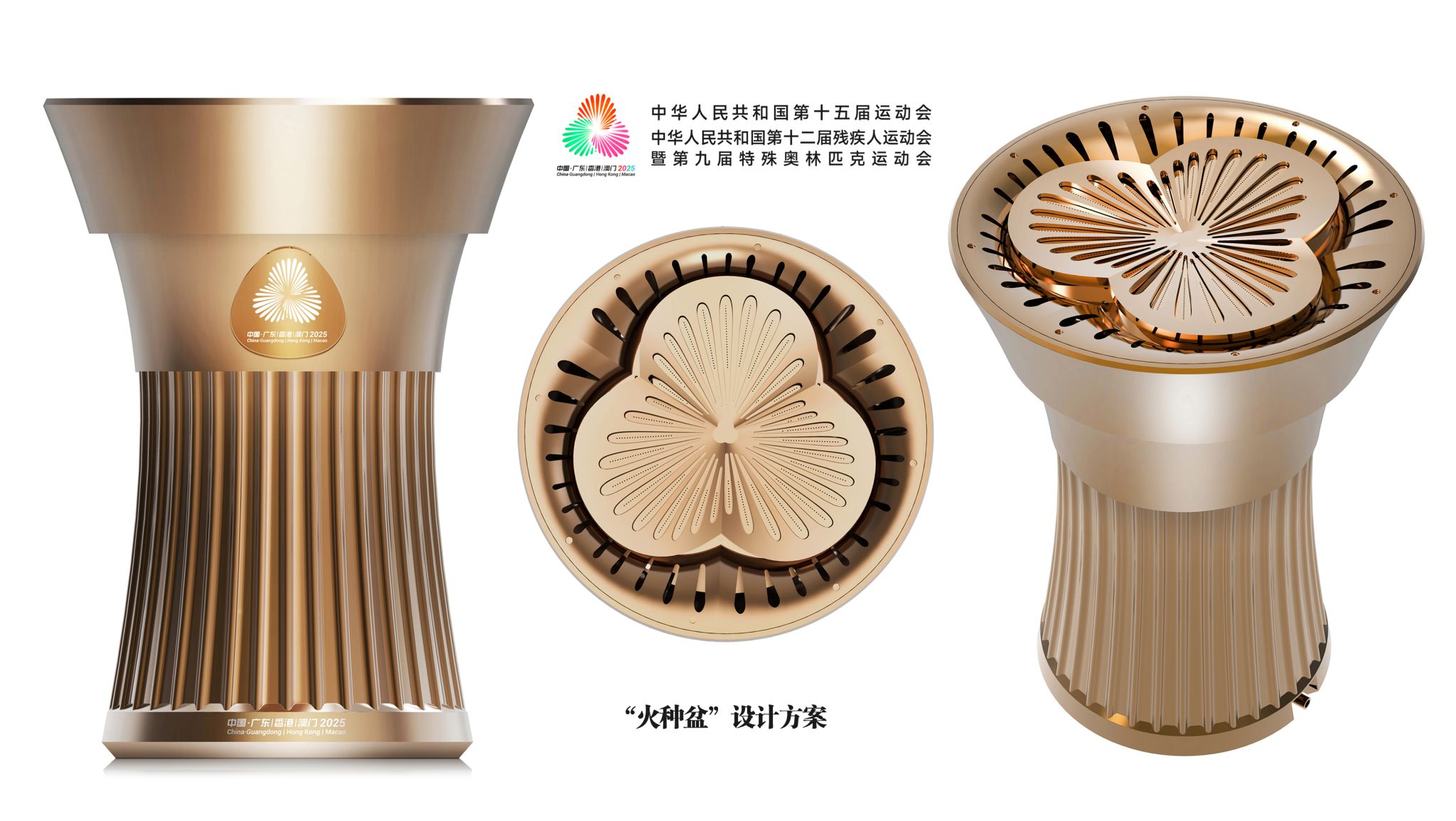 设计中,火种盆顶部三瓣礼花同根共绽,与赛事会徽 “礼花绽放” 形成呼应,既象征粤港澳三地同根同源、携手并进的深厚联结,也寓意三地人民心手相牵,共圆民族复兴中国梦。团队紧扣会徽 “同心礼花、同心同源、深度融合” 的主题,以 “礼、源、融” 为文化根基,从《古文观止》《中国青铜器》等典籍中汲取养分,最终让 “花觚” 这一古礼器与现代体育盛会实现精神共鸣——既彰显三地 “热情好客” 的礼仪之道,又传递联办赛事的 “激情如火”。