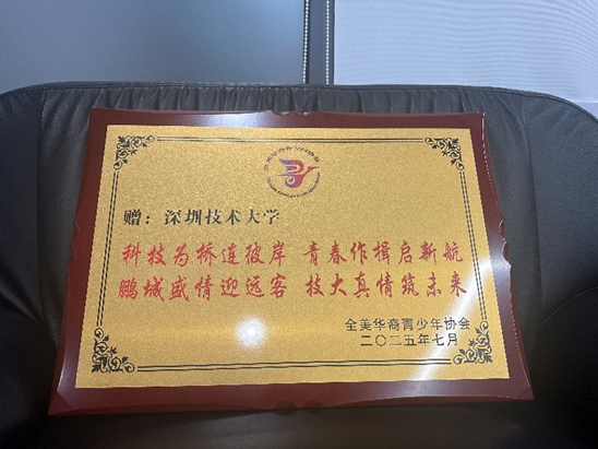 结营仪式上,全美华裔青少年协会向深技大赠送牌匾,题字“科技为桥连彼岸,青春作揖启新航;鹏城盛情迎远客,技大真情筑未来”,寄托美好期许。深技大国际合作与交流部主任曾思予勉励同学们成为中美人文交流的“青春信使”,以青年之力推动文明互鉴。