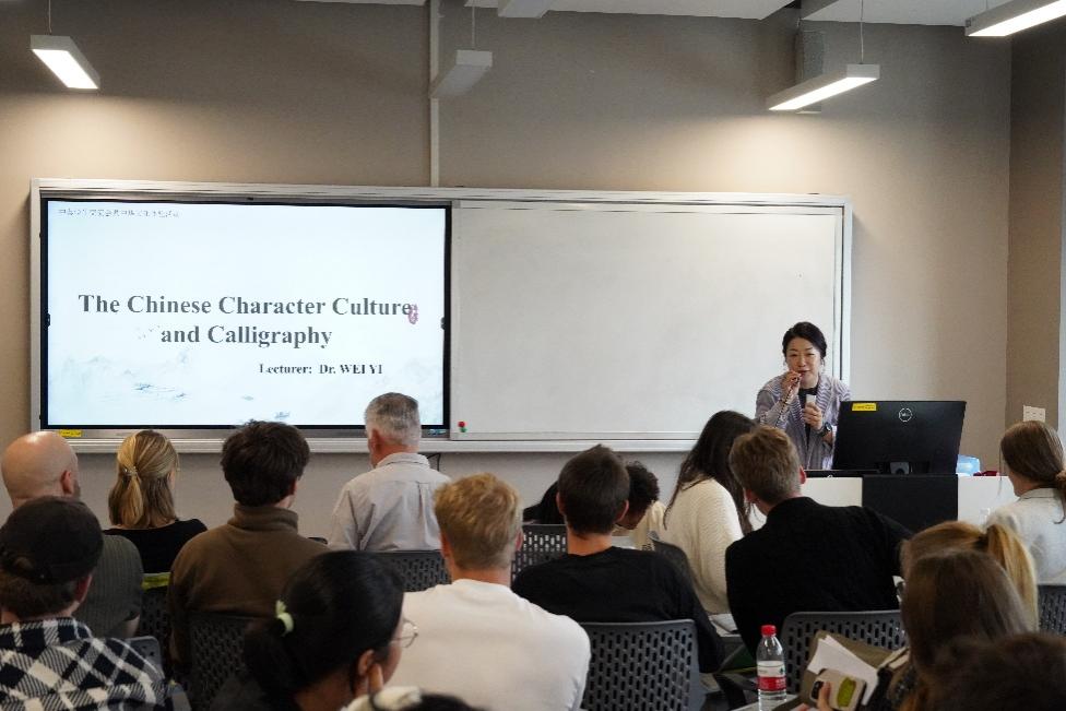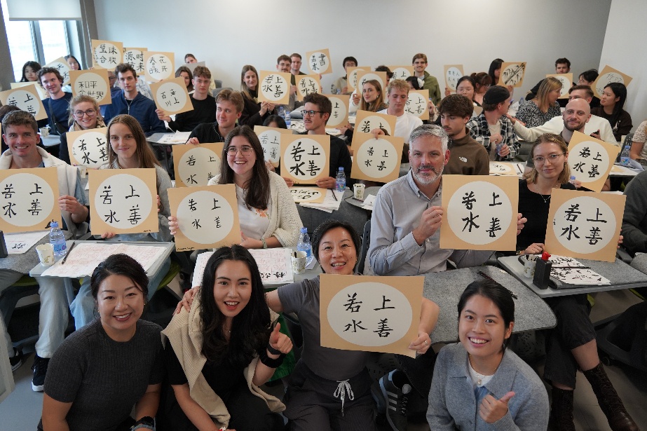 中华文化体验与座谈交流同样亮点纷呈。在外国语学院,深技大教师带领代表团师生体验书法艺术,墨香中交织着跨文化交流的欢声笑语;院长钟玲向代表团介绍了学院国际交流成果,彰显深技大在中外青年沟通中的桥梁作用。在商学院,副院长李杰介绍了学院全英文授课、国际化师资队伍建设等特色,并与代表团就校园生活、深圳城市发展等话题深入座谈。代表团一行还参观了智能会计实训室、数字经济实验室等教学设施。