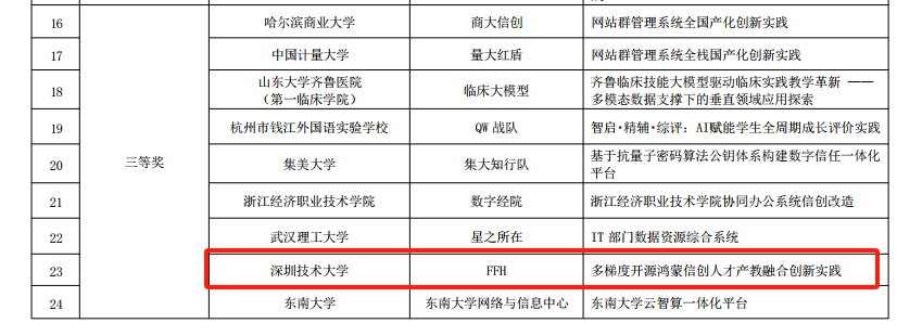 11月13日至15日,2025第二届教育信息技术应用创新大赛在杭州落幕。该赛事由中国教育技术协会主办,浙江大学与中国教育技术协会网络安全专业委员会联合承办,吸引全国732个教育行政单位及高校的6198名师生组建2474支队伍参赛。李蒙教授团队申报的“多梯度开源鸿蒙信创人才产教融合创新实践”案例,在“信息技术应用创新案例赛”赛道中脱颖而出,斩获全国三等奖。