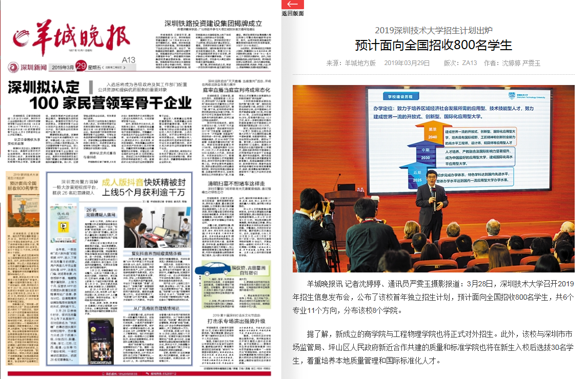 据了解,新成立的商学院与工程物理学院也将正式对外招生。此外,该校与深圳市市场监管局、坪山区人民政府新近合作共建的质量和标准学院也将在新生入校后选拔30名学生,着重培养本地质量管理和国际标准化人才。