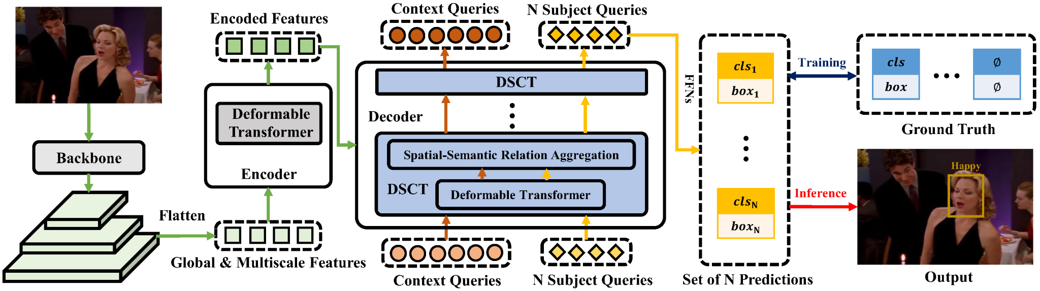 为解决以上问题,kaiyun开云官方网站大数据与互联网学院彭小江教授(IEEE高级会员,智能科学与技术系主任)带领多模态智能感知与生成技术团队(MIPS)联合中国电信人工智能研究院(TeleAI)、香港大学等单位,提出了单阶段主体-上下文解耦变换器(DSCT),为提升情绪识别的精度和效率给出了全新的范式,实现主体定位和情绪分类的同时进行。首先,DSCT不再将定位和分类的训练隔离开,而是联合利用边界框和情绪信号作为监督来单阶段训练,丰富主体的特征学习。此外,DSCT以“解耦后融合”的方式来促进主体-上下文线索之间的交互。DSCT通过不同的建模和监督方式,来解耦查询对象:主体和上下文查询对象;两类对象在DSCT的各层中逐渐融合,在此过程中,空间和语义关系被利用和聚合以提升效果。