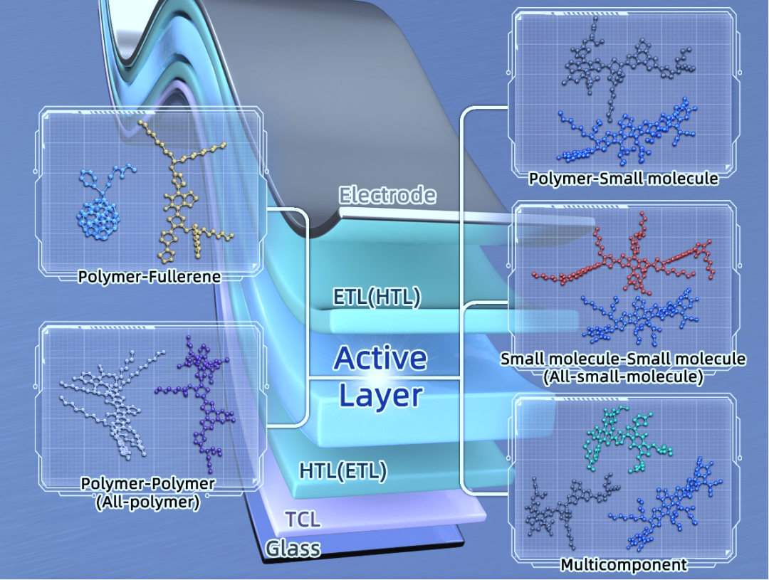 以钙钛矿太阳能电池和有机太阳能电池为主要代表的新型薄膜太阳能电池即将迈入大规模产业化阶段。相比于传统无机厚膜太阳能电池,有机太阳能电池(OSC)因其柔性、半透明性、高室内光匹配性、单位重量发电量高和潜在生物兼容性等特点,在发电玻璃幕墙、车载光伏、物联网供电、生物植入等分布式光伏领域具有优势。在过去十年,得益于各种高性能有机电子受体和电子给体材料的发展,包括用于光活性层的聚合物、小分子和富勒烯等,OSC的性能得到了大幅提升。根据给体和受体材料的组合,OSC可分为几种主流类型:聚合物—富勒烯、聚合物—小分子、全聚合物、全小分子,以及多组分有机太阳能电池。