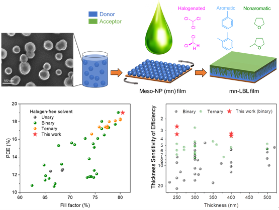 谢谌助理教授团队长期致力于新型光伏器件的绿色加工工艺的优化,目前已取得的成果中依然保持着水系溶剂加工有机光伏的最高效率纪录。近期,该团队开发了一种使用水溶液制备OSC的新型工艺,将疏水的有机电子给体材料在水中分散成的纳米颗粒(NP)墨水溶液,构建成介孔结构的给体薄膜,与电子受体材料结合后,形成了有利于电荷高效传输的垂直纳米形貌。基于水系介孔材料加工的二元PM6:BTP-eC9太阳能电池的效率超过了19%(此为非卤代溶剂加工的OSCs最高效率之一),并具有很高的热稳定性以及大面积加工特性,其各方面性能都优于毒性卤代溶剂加工的同类器件。此外,高厚度器件的效率(250 nm为18.2%,400 nm为17.2%)超过了之前报道的二元OSC的最高记录。此类基于水系涂料的加工工艺有助于实现OSC从实验研究向产业加工的有效转化。