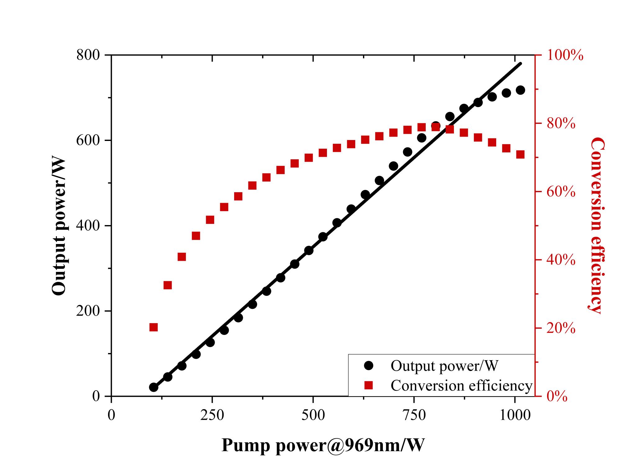 项目团队采用锁定波长的969nm“零声子线”泵浦,实现了最高连续输出功率>1300W,最大光-光转化效率接近80%,其优异性能为千瓦级平均功率以及百毫焦的超快薄片激光器研究奠定了重要基础。