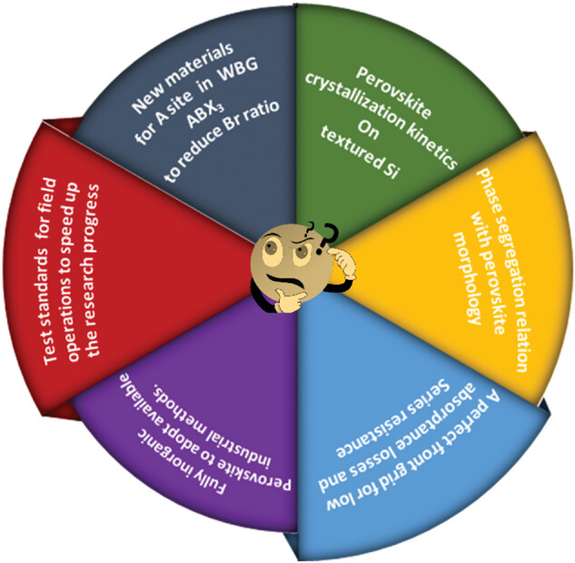 尽管实验室研发效率已经超过30%,但叠层电池产业化仍然面临一系列挑战,其中两个主要挑战为宽带隙(WBG)钙钛矿和绒面硅衬底。两个挑战引发了包括相偏析、电压损失、钙钛矿应力应变、高复合率和分流路径等一系列问题。此外,这些问题的复杂性增加了对WBG钙钛矿和硅绒面之间关系明析的困难度,这已经成为进一步提高PSTSCs效率的重大障碍。