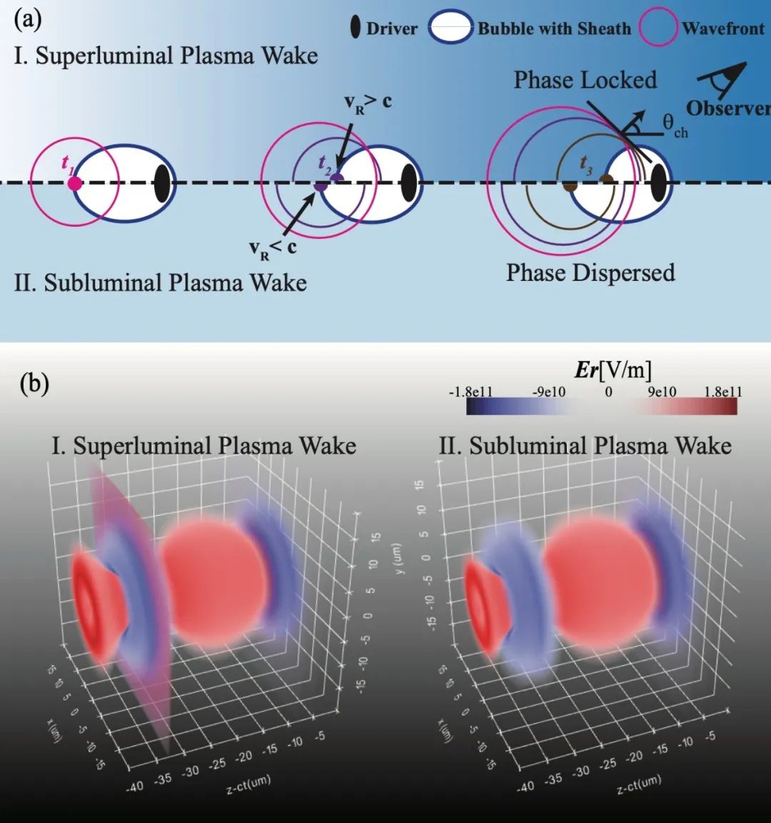 (a)相对论电子束打到等离子体中在空泡尾端产生光激波的示意图;(b)大型超算数值模拟中看到的超光速空泡尾端的光激波辐射。