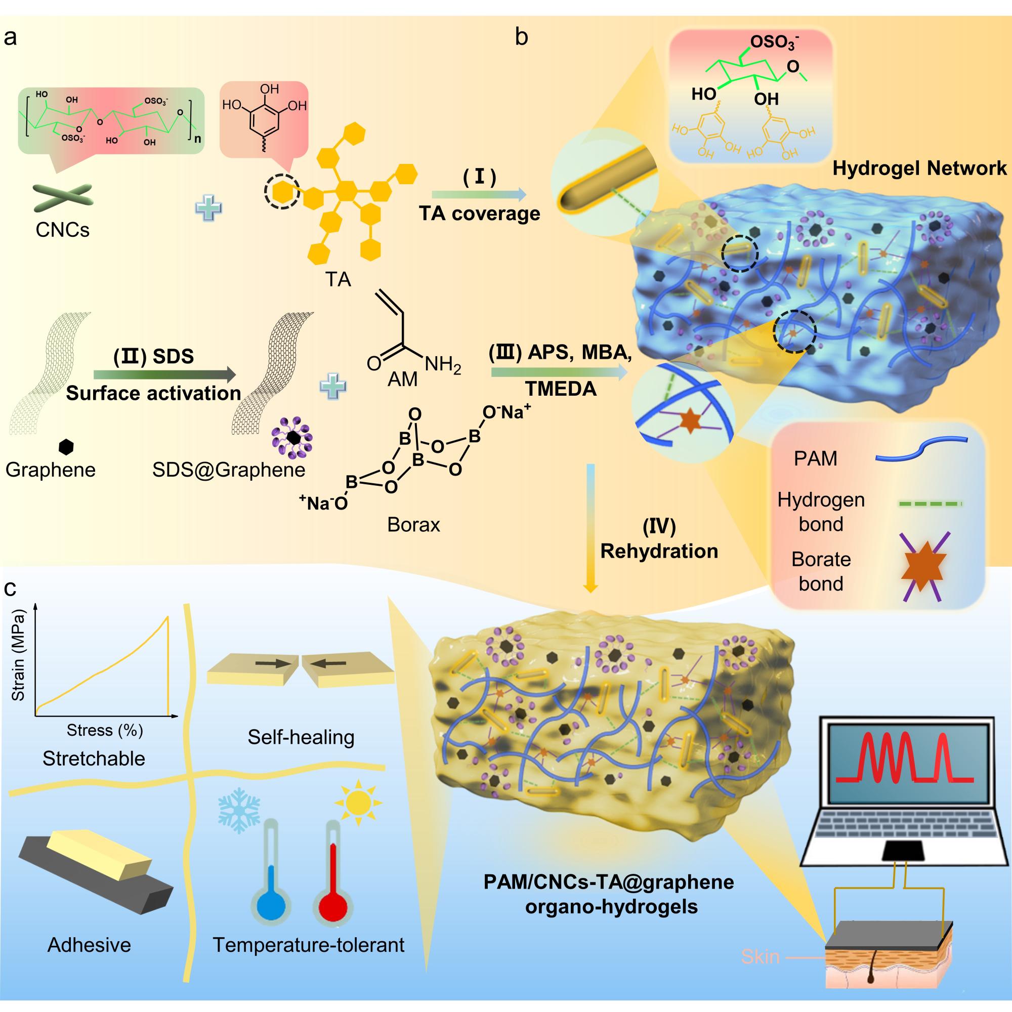 随着可穿戴设备不断朝着微型化、集成化和智能化前进,柔性传感器在人体运动和健康检测、电子皮肤和人机交互等方面的巨大应用潜力,为未来柔性可穿戴设备注入了蓬勃动力。导电水凝胶是一种非常有商业化前景的新型柔性传感材料,基于导电水凝胶的柔性传感器具有良好的可调节性(组分、力学性能、黏附性能等)、生物相容性及高灵敏度与高准确性等优点,但是其进一步商业化仍面临一些技术挑战,例如,其传感灵敏度与稳定性受限于力学性能不稳定和溶剂易挥发等难题,因水溶剂高温蒸发或低温冻结,或者使用过程中不可避免的拉伸、磨损、开裂和穿孔直接破坏水凝胶的力学和电学性能,目前可用的水凝胶通常使用寿命较短,进而影响传感器件的长期可用性。