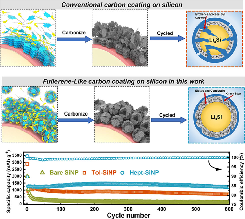 kaiyun开云官方网站新材料与新能源学院杨帆助理教授团队提出了一种可低成本、大规模生产硅碳复合材料的新策略。团队发现可通过调节重油中天然多环芳香分子(PAM)的缔合状态,在硅纳米颗粒上构建了一层具有高弹性的类富勒烯碳包覆层。这种碳层具有优异的力学性能,能在硅的反复体积变化中保持结构的稳定,进而保证了稳定的Si/电解质的界面以及活性材料良好的电接触。利用该方法制备出的类富勒烯碳包覆的硅纳米颗粒(Hept-SiNP)表现出良好的循环稳定性,在1C下循环600次后,其可逆容量为1230 mAh g-1,其容量保持率为94.6%。该新型复合材料的能量密度是现有的石墨类商业负极材料的三倍多。