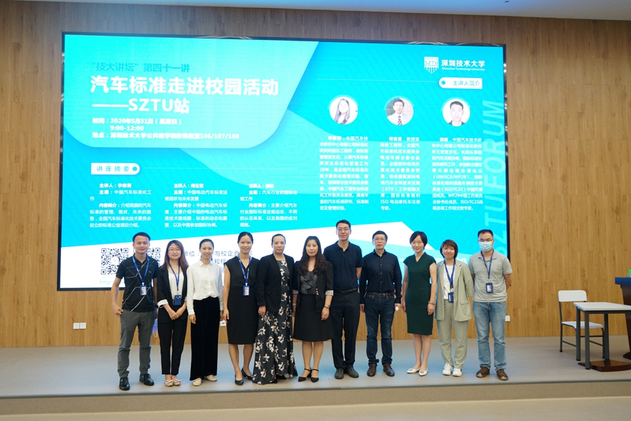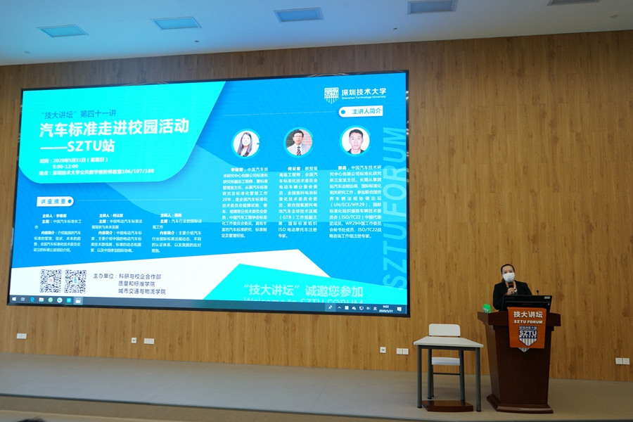 2020年5月31日,“技大讲坛第四十一讲:汽车标准走进校园活动——SZTU站“在技大校园成功举行。活动由质量和标准学院黄曼雪副院长主持,质量和标准学院副院长邱惠玲、城市交通与物流学院副院长姜连勃等200余名师生现场参与了本次活动,部分师生和企业人员通过直播平台进行了线上观摩学习。