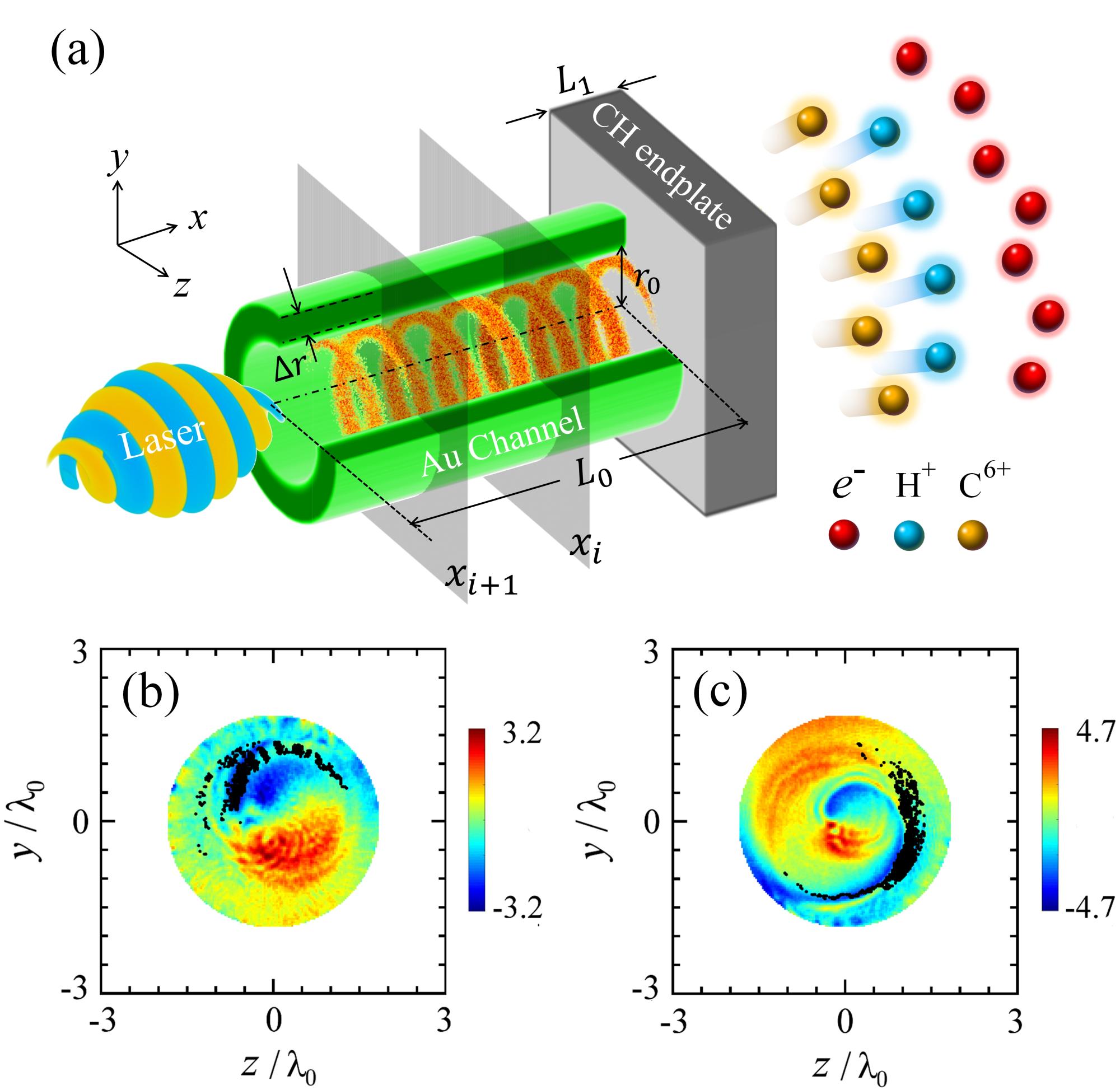 激光不仅可以有自旋角动量,也可以有轨道角动量,通常带有轨道角动量的激光被称为涡旋激光,这种激光以其奇异性和拥有特殊的螺旋相位波前的特点被广泛应用于光学显微镜、光学微操控(2018年诺贝尔物理学奖)、光通信、量子信息、成像等多个领域。对于低能X射线源,有几种方式产生有轨道角动量的光子束,然而对于更高能(如千兆电子伏特)的伽马射线源,如何产生轨道角动量仍然是重要的挑战。在本工作中,中心研究团队首次提出利用超强涡旋激光与低密度等离子体相互作用获得角动量可调的高亮度高准直伽马射线源的物理机制。发现在一定匹配条件下,可以通过组合电子加速机制获得能量高达GeV(109eV)的涡旋电子束,这些螺旋运动的高能电子进一步通过同步辐射方式可以产生带有轨道角动量的涡旋伽马射线源,并且通过改变涡旋激光的拓扑荷数或激光强度可以调控伽马射线源的轨道角动量大小。此外,通过该机制获得的伽马光源亮度比目前实验室中所获得亮度要高两个量级以上,而其轨道角动量对应的扭矩要高三个量级以上。这些带有轨道角动量的高亮度特殊伽马射线源在材料磁性探测、高密度物质成像、核物理研究、天体物理研究等方面具有重要的应用前景。