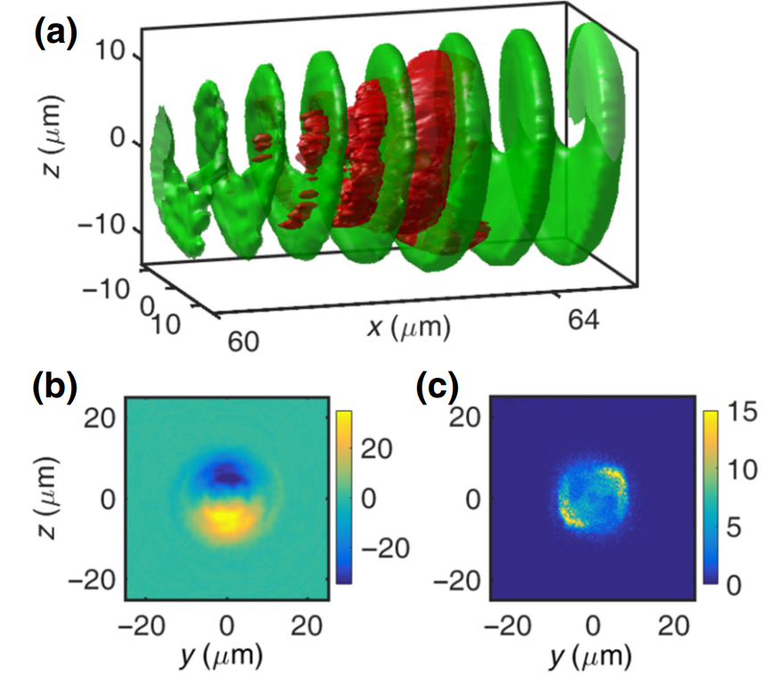图1.(a)超强涡旋激光(绿色)和产生的涡旋伽马射线(红色) (b)涡旋激光的横向激光电场分布 (c)产生涡旋伽马射线的能量密度分布
