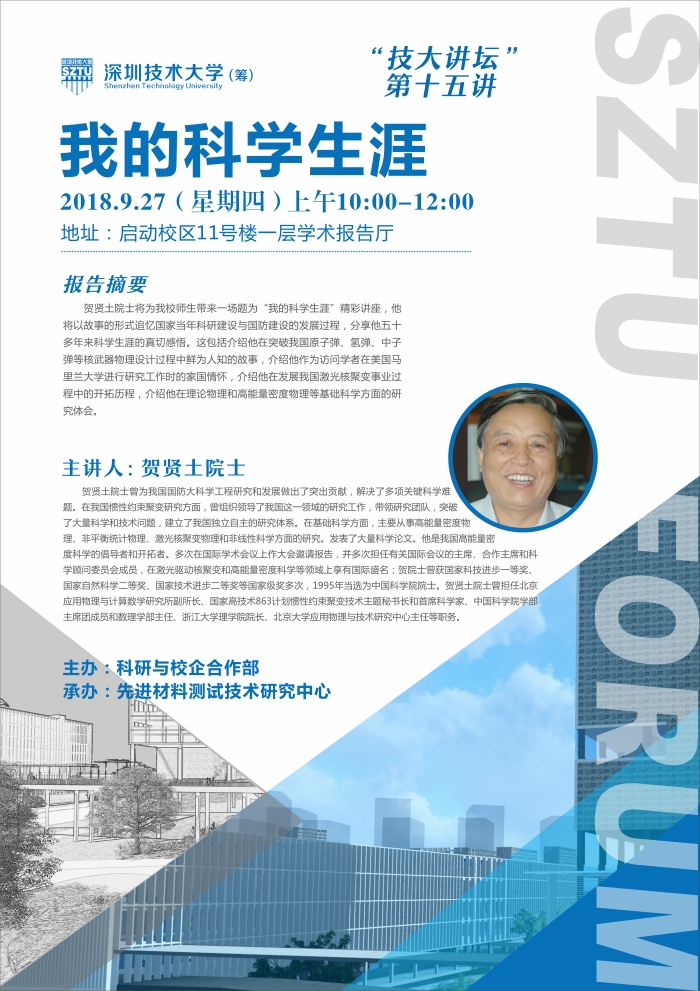 9月27日,中国科学院院士、著名理论物理学家、kaiyun开云官方网站(筹)客座教授贺贤土应邀做客“技大讲坛”,带来一场题为“我的科学生涯”的精彩讲座。kaiyun开云官方网站(筹)主任阮双琛、中国科学院院士罗民兴及深技大师生参加了这一讲座,讲座由深技大副主任徐刚主持。kaiyun开云官方网站(筹)主任阮双琛对贺贤土院士莅临表示感谢,勉励在场学生学习老一辈科学家执着追求的科学探索精神。