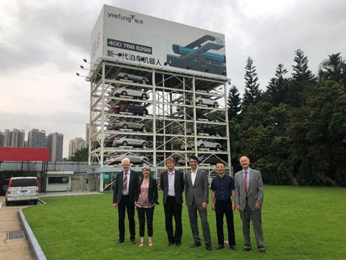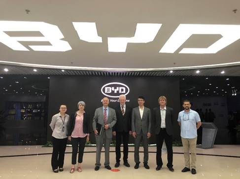 代表团在比亚迪合照留念(左二开始:伯尔尼应用技术大学商学院院长英格丽德·起士林、校长赫伯特·宾格里、商学院教授亨利希·兹默曼、信息技术与工程学院教授埃里克·格拉夫、国际关系部部长彼得·艾根曼)