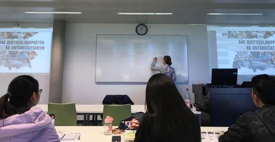 FHWS的德语老师追求将德语与生活结合在一起,并以德国的地图及各个城市的独特产品作为课程切入点,装载着SZTU德语课程的方位辨识部分的知识。而这种轻松的上课方式更加容易吸收知识,少了强迫性使学生更容易接受。此外,通过介绍德国的各种啤酒、各种汽车和各种特色产品在德国的分布,所记住的知识更加全面,毕竟让语法穿插在日常生活交流中才是最好的学习外语的方式。值得一提的是,课程有大部分的时间通过观看关于德国文化和特色的视频,然后做关于视频的练习。