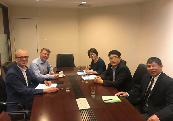 深技大代表团与慕尼黑应用技术大学副校长克劳斯·克莱里希教授(左一)、汉斯·赛德尔基金会上海代表处首席代表邵贝德教授(左二)进行座谈。