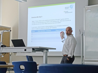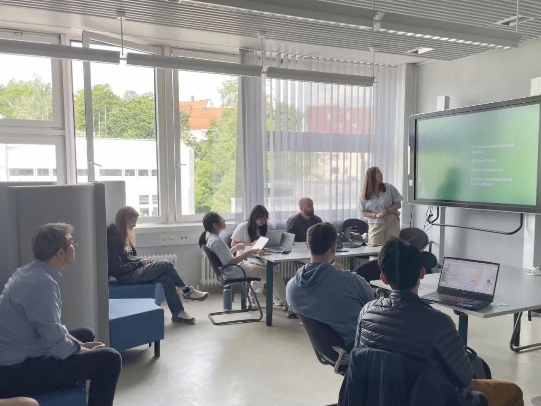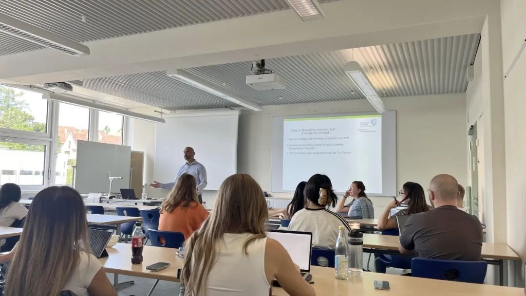 真实、沉浸式的商业环境可以让同学们迅速学习和掌握运营一家公司的方法。在《商务管理模拟》课上,肯普滕应用技术大学商学院副院长Martin Göbl教授通过线上商业模拟软件为同学们提供了与现实公司完全一致的商业环境。他组织同学们分组成立5家经营打印机的公司并进行角色扮演,每个公司拥有相同的初始资源,每组成员分别扮演CEO(首席执行官)、采购、财务、人力等角色。每人都需要运用专业知识计算资源的分配方式,集体讨论决策出公司的发展方向,并在课上进行成果展示。