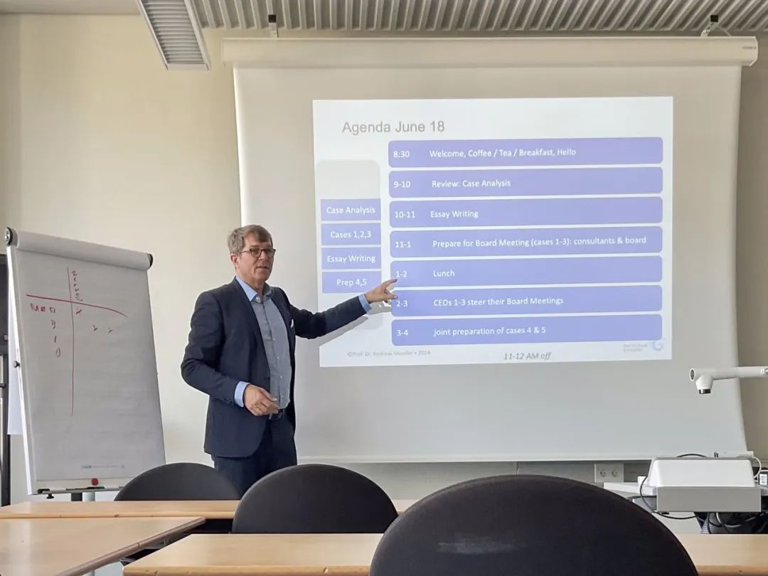 《案例研究》课程则以另一种模拟方式呈现。商学院Andreas Müller教授在讲解案例研究相关知识的同时,组织大家分组研讨分析国际商业案例、模拟商业咨询活动和董事会会议。