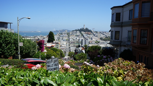 第三站同学们来到九曲花街(Lombard Street),当初在十九世纪二十年代的时候,这条街是为了使繁忙的交通有所喘息而设计建造的。九曲花街因一路段有八个急弯而闻名,40度的斜坡,且弯曲像“Z”字形,所以车子只能往下单行。街道上遍植花木,因正值夏季、繍球、玫瑰和菊花等将街道点缀的花团锦簇。同学们在这里也登上了花街的最高处,远眺海湾大桥和科伊特塔。