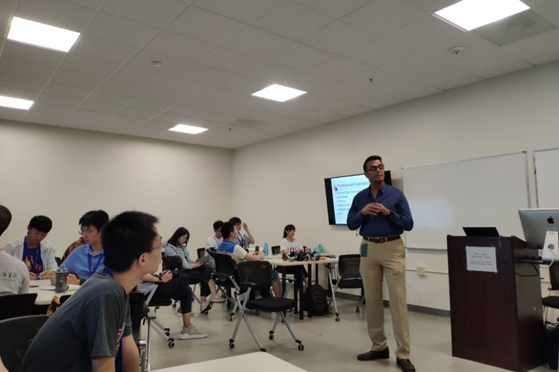 8月15日的课程由Nik Tehrani教授开启,他生动地为同学们讲授了“How to do presentation”。Nik Tehrani教授分别从多练习、有准备、带自信、做自己等多个方面阐述了如何做好一次演讲。关于演讲,他告诉了同学们一个全新的观点:“Be Yourself!”要坚定相信自己是宇宙的中心,不要试图模仿他人的风格。即使演讲的时候会紧张发抖也没关系,接受自己。这对同学们是一个新颖的看法。许多同学一直对在众人面前演讲有着恐惧。这个建议让大家演讲时更加自信。另外他谈到,硅谷之所以是硅谷,不是因为不怕输,而是在于这里的人想要赢,既然已经选定了目标,那就只顾风雨兼程,别无他想。