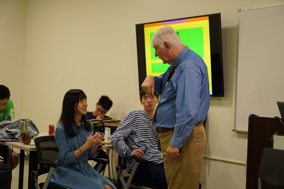 Richard Riehle教授从事计算机领域的教学与研究四十余年,他认为软件工程是一个有序的逻辑过程,并用流体力学中机翼的重力和气压,以及软件的简洁性与可视化相悖的例子深入浅出地揭示了软件工程调和矛盾的本质。在课堂的最后,教授还用等差数列求和代替“for语句”的应用,展现了数学在简化代码的重要性。