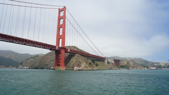 终点站是近代桥梁工程的一项奇迹,也就是远近闻名的金门大桥。其桥身全长1900多米,由桥梁工程师约瑟夫·斯特劳斯设计,历时4年,利用10万多吨钢材建成。金门大桥的上空弥漫着淡淡的雾气,使得金门大桥若隐若现,这种神秘感使同学们迫不及待想登上这一座旧金山的标志性建筑。