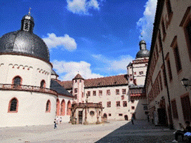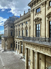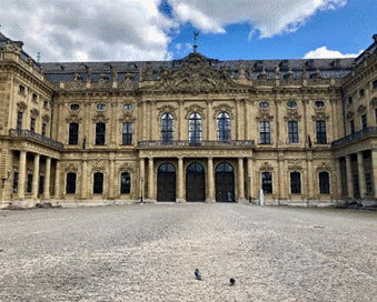 另外,见识了维尔兹堡的热闹后,大家还参观了维尔兹堡垒主教宫,此宫殿在二战时期受到猛烈轰炸,受损大半,在宫殿内历史展区处陈旧的黑白照片可见到当年的沧桑历史;不过严谨的德国人还是按图索骥,分毫不差地原样重建了,这也体现着他们对历史深刻的尊重。宫内有著名的黄金镜厅,富丽堂皇,震撼人心,给予了参观者巨大的视觉冲击感。