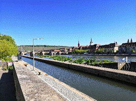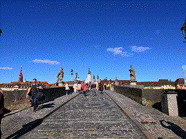 同时,维尔兹堡是德国浪漫之路的的开端之城,浪漫之路北起维尔兹堡,一路向南穿越河谷,农田,森林,草地以及山峦,途径中世纪小镇罗滕堡、丁克尔斯比尔以及著名城市慕尼黑,落脚在阿尔卑斯小镇菲森,全程366公里。参加FHWS夏季实训的深技大学子所居住的旅社便位于浪漫之路起始,贯穿维尔兹堡的美因河旁。在不远处,便是横跨美因河的老美因桥,每当到了下午五六点,桥上总是站在许多年龄各不相同的当地居民,人手一杯白葡萄酒,赏着河边美景,迎着拂面微风,与身边的人畅谈生活,这是多么美妙和谐的一幅画卷。