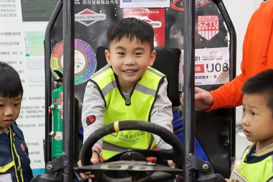 在“导游老师”的辅导下,小朋友还试乘了我校赛车工作室研制的U8赛车。