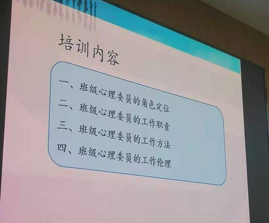 为提高心理委员的工作能力,心理中心制定了系统的培训方案,定期对各班心理委员进行工作培训,使他们能够运用所学的知识为班级同学服务,充分发挥心理委员在我校大学生心理健康教育和危机干预工作中的重要作用。