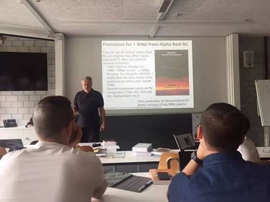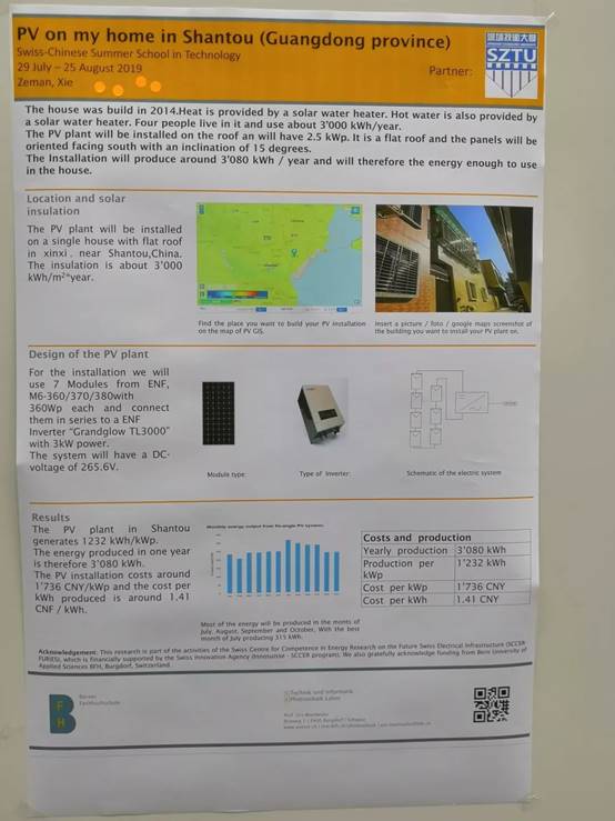 这次,我们的项目是独立完成一个太阳能发电系统,用于自己家的发电供应。课上不仅教导了太阳能的优势劣势,应用前景以及新能源应用的必要性,更一步步教我们如何应用太阳能电池组件来组建系统。更让有建设经验的工程师来亲自传授我们太阳能电池的检测项目,评估条件,亲自让我们参与检测电池,让我获益良多,体会深刻。同时,在完成项目的同时,我们有更多的机会和瑞士的小伙伴交流,因此增进合作意识以及交流技能,更锻炼了英语口语,我相信,这次授课结束后同学们一定获益良多。