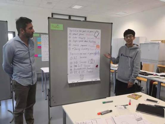 课堂上,大家分组围绕着关于如何面对“工业4.0”全球化可能导致的文化冲突,以及过去十年中出现过的和未来十年里可能出现的科技创新展开了热烈的讨论。同学们通过图画、文字、演讲等方式向教授和其他同学阐述自己的想法,整个课堂氛围十分融洽,我们也在课堂上受益匪浅。