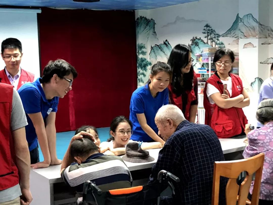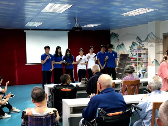 最后,同学老师们在将爷爷奶奶们送到食堂后,在颐康院的大厅合照,纪念这一次有意义的志愿活动