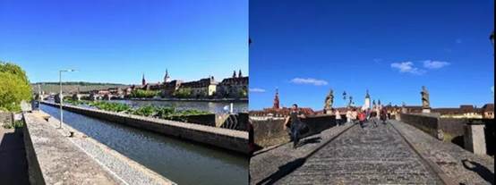 同时,维尔兹堡是德国浪漫之路的的开端之城,浪漫之路北起维尔兹堡,一路向南穿越河谷,农田,森林,草地以及山峦,途径中世纪小镇罗滕堡、丁克尔斯比尔以及著名城市慕尼黑,落脚在阿尔卑斯小镇菲森,全程366公里。参加FHWS夏季实训的深技大学子所居住的旅社便位于浪漫之路起始,贯穿维尔兹堡的美因河旁。在不远处,便是横跨美因河的老美因桥,每当到了下午五六点,桥上总是站在许多年龄各不相同的当地居民,人手一杯白葡萄酒,赏着河边美景,迎着拂面微风,与身边的人畅谈生活,这是多么美妙和谐的一幅画卷。