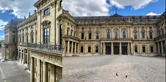 见识了维尔兹堡的热闹后,大家还参观了维尔兹堡垒主教宫,此宫殿在二战时期受到猛烈轰炸,受损大半,在宫殿内历史展区处陈旧的黑白照片可见到当年的沧桑历史;不过严谨的德国人还是按图索骥,分毫不差地原样重建了,这也体现着他们对历史深刻的尊重。宫内有著名的黄金镜厅,富丽堂皇,震撼人心,给予了参观者巨大的视觉冲击感。